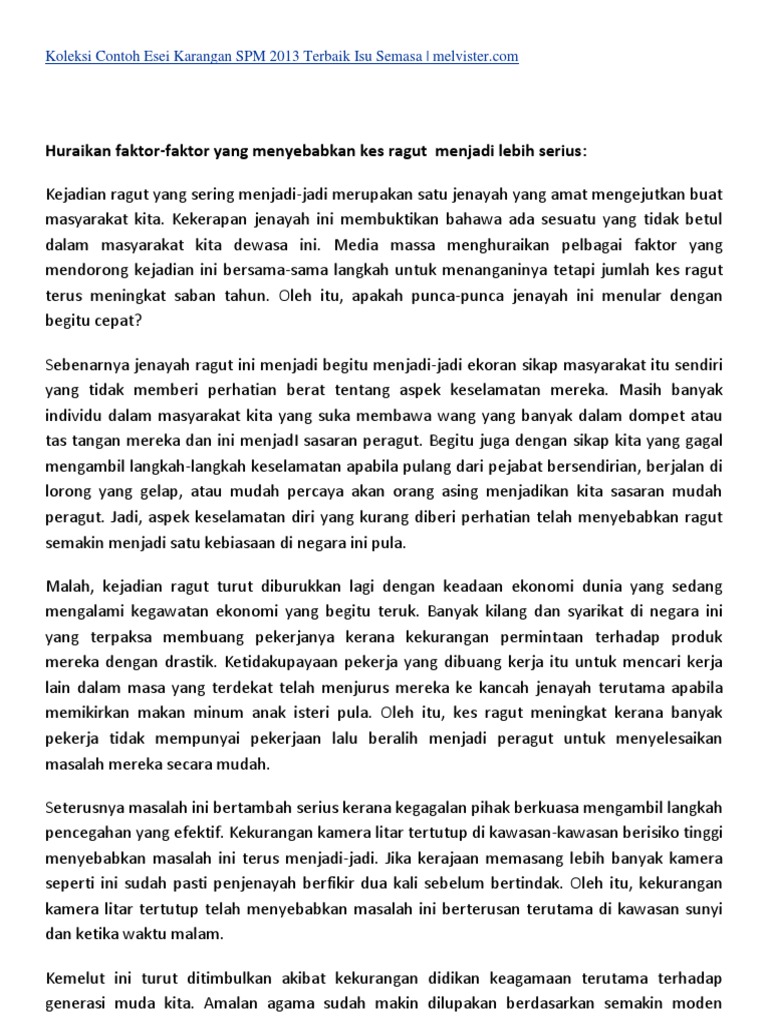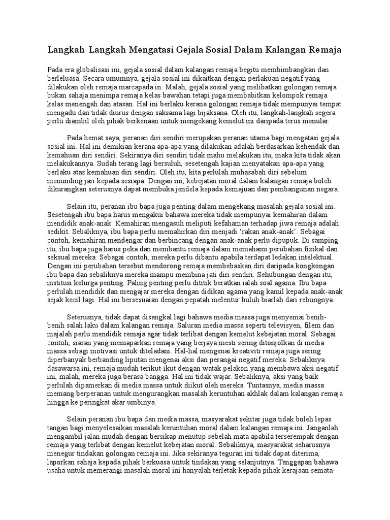Pengertian gejala sosial adalah suatu fenomena yang ditandai dengan timbulnya permasalahan sosial yang mempengaruhi dan dipengaruhi oleh tingkah laku gejala sosial (social symptom) dan masalah sosial merupakan dua hal yang sangat berkaitan. Punca punca berlakunya gejala sosial dalam kalangan remaja. Contoh karangan spm gejala sosial remaja dan kesannya. Karangan spm perlu dikuasai oleh semua murid yang mengambil spm kerana ini merupakan mata pelajaran yang wajib lulus. Masalah sosial dalam kalangan remaja. Gejala sosial berpunca dari masalah. Maklumlah, seseorang akan lebih terpengaruh dengan gejala sosial apabila berada dalam ambang kegagalan dan kekecewaan. Gejala sosial huraikan pendapat anda tentang punca punca yang menyebabkan masalah ini berlaku dan tuliskan cadangan cadangan tentang peranan ibu bapa dalam menangani gejala tersebut. Langkah mengatasi gejala sosial dalam kalangan remaja. Home karangan spm spm contoh pendahuluan dan penutup karangan spm. Contoh dialog antara pelajar tentang masalah gejala sosial dalam. Contoh karangan gejala sosial remaja pmr natal 6. Peranan keluarga menangani masalah sosial contoh karangan spm dewasa ini, masalah gejala sosial di negara kita semakin serius.